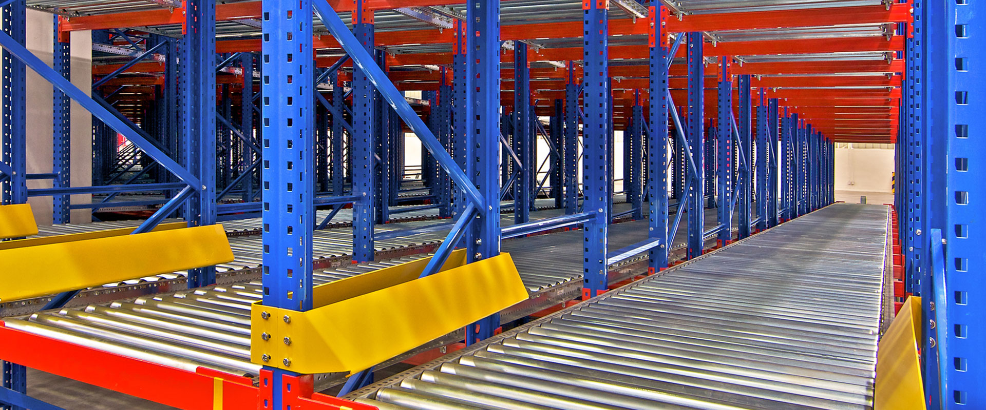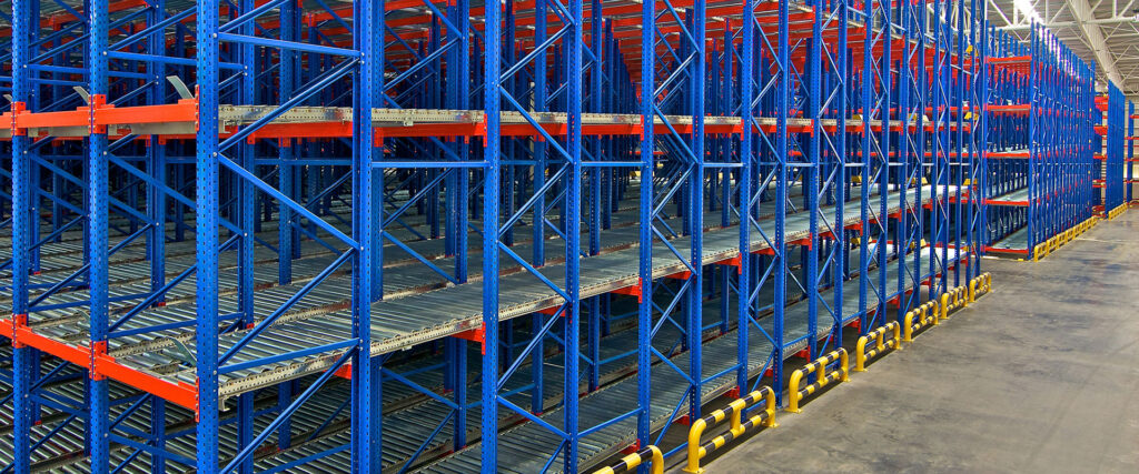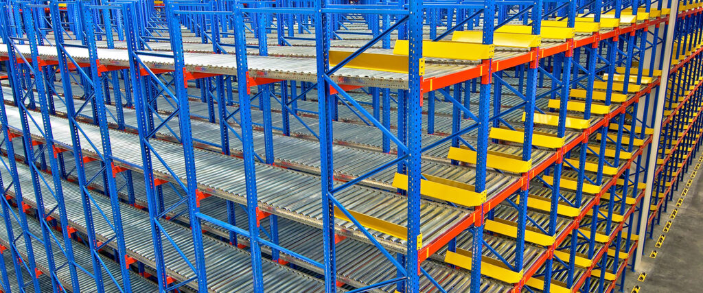 High density racking designed to optimise warehouse flow and space efficiency through controlled first in, first out stock movement.