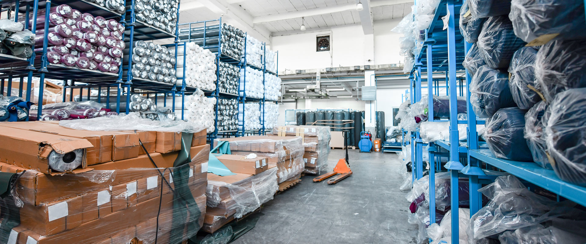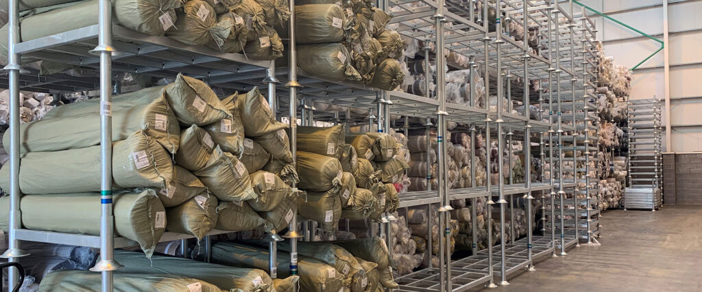 Palletower supply carpet racking for all sizes of warehouses, ranging from thousands of yards of fine materials to wide-diameter carpets, vinyl rolls, and more.