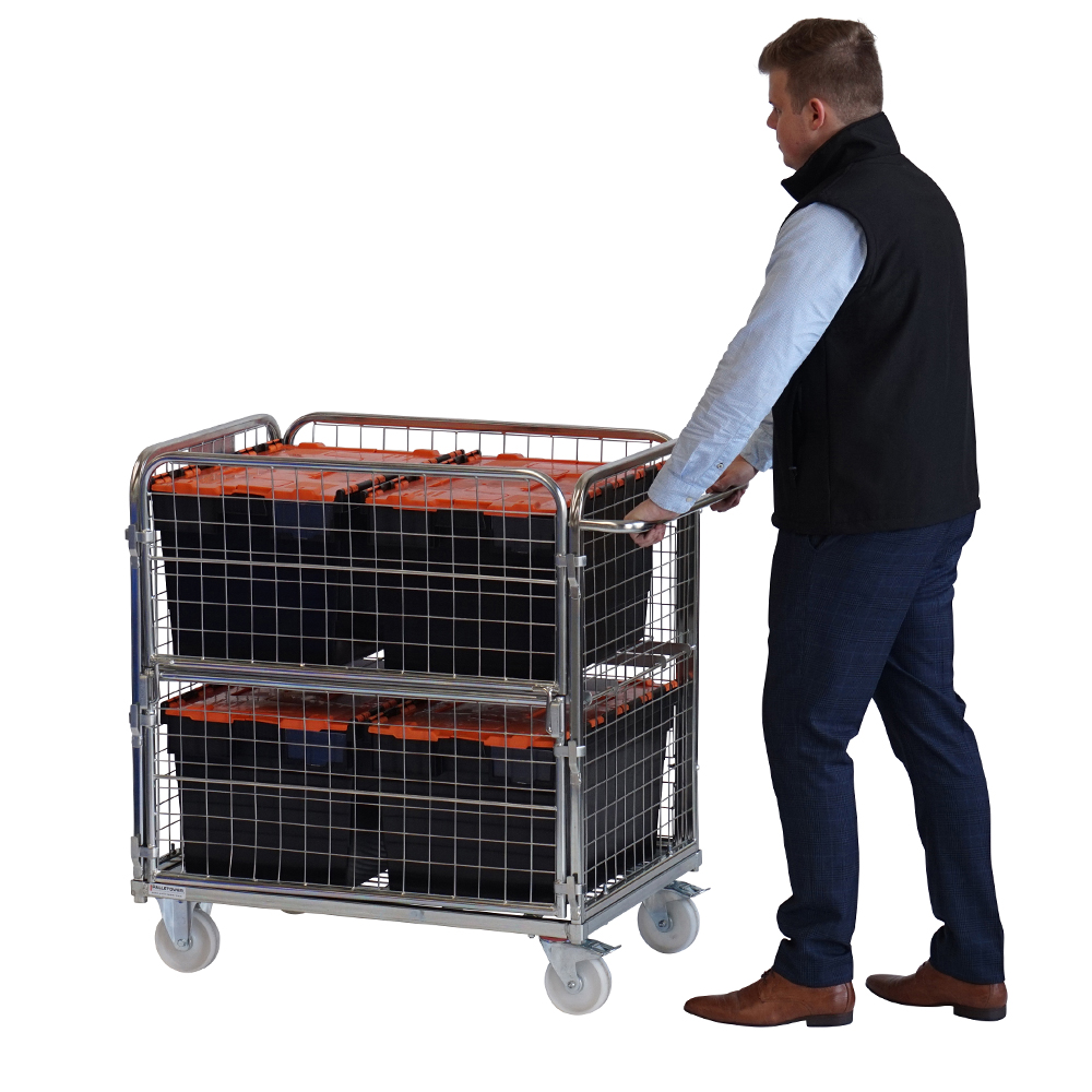 The four sided compact merchandise picking trolley has been designed specifically to accommodate four 600x400mm tote Boxes. The sides all have 50mm infill to stop any loose product falling out of the sides in use. The half gate on one long dimension makes it easy to secure the totes or product in the merchandising trolley whilst been able to have quick easy access. A push/pull handle bar along one short dimension allows for easy manoeuvrability when empty or loaded to capacity. The 20.MT7 is also fitted with two fixed and two swivel brake non marking heavy duty nylon castors. Extremely versatile for use in a variety of environments including warehousing, retail, healthcare and pharmaceuticals.