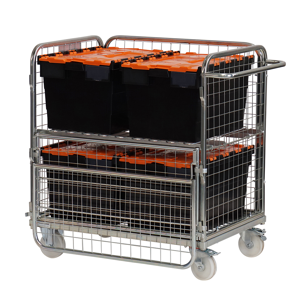 The four sided compact merchandise picking trolley is extremely versatile with the capacity to hold a shelf and up to four of our attached lid containers. For use in a variety of environments including: